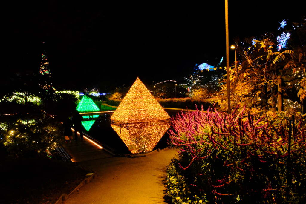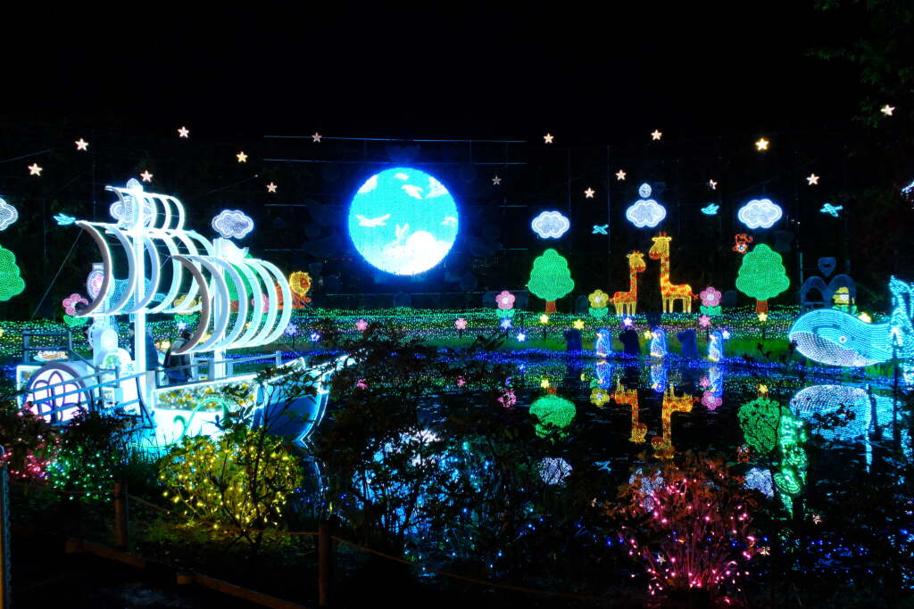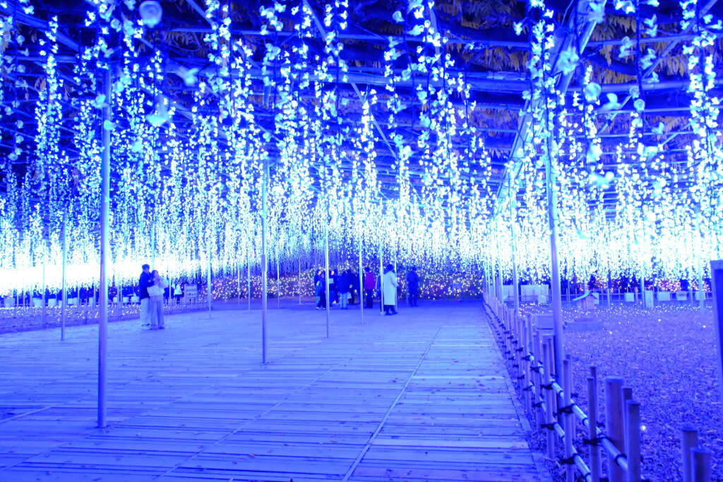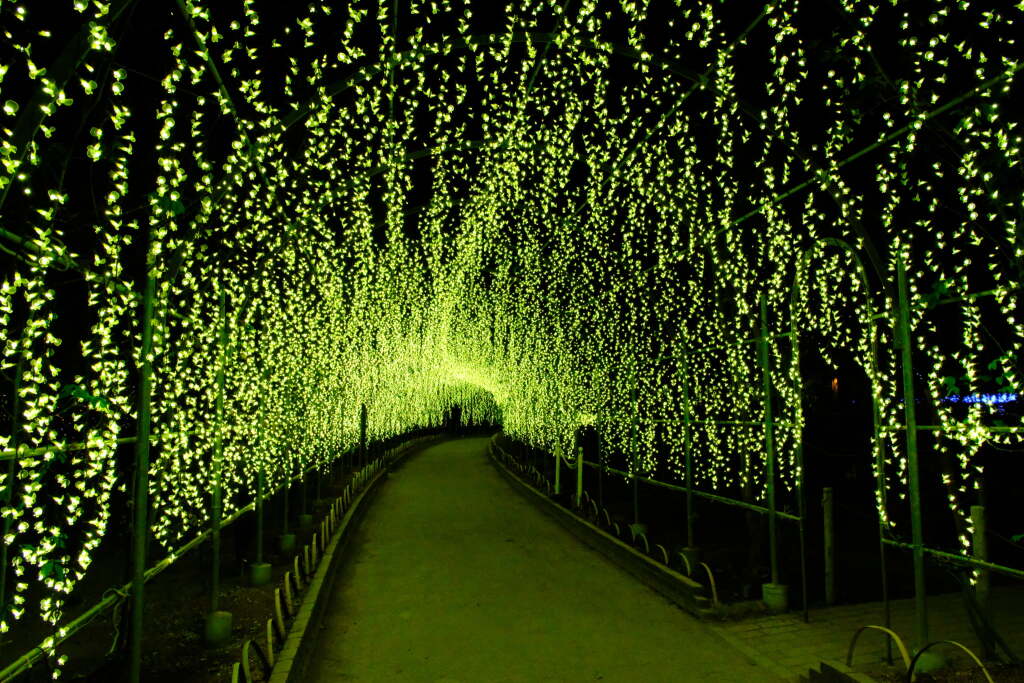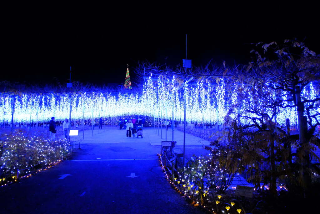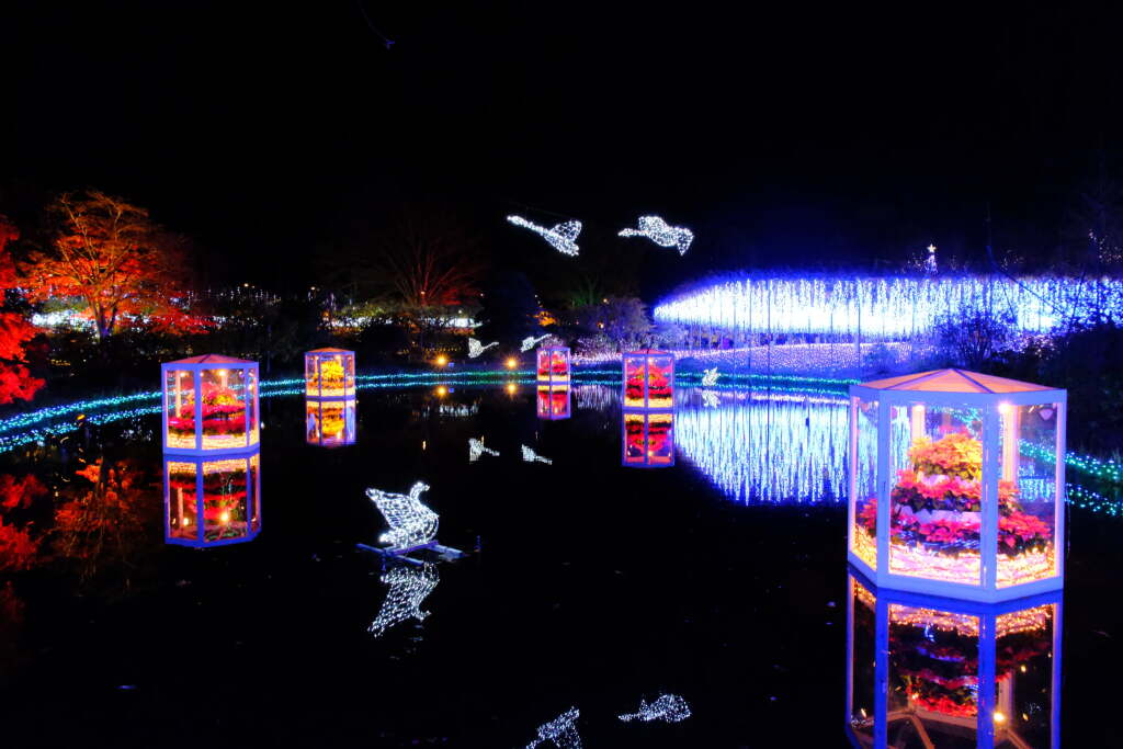 During this period, flowers are not the main attraction. Instead, the illumination focuses on light-based displays that transform the entire park. Areas beneath the wisteria trellises, along garden paths, and around ponds are illuminated, creating a completely different atmosphere compared to the daytime. Reflections of the lights on the water are especially striking and are considered one of the highlights of the winter illumination.