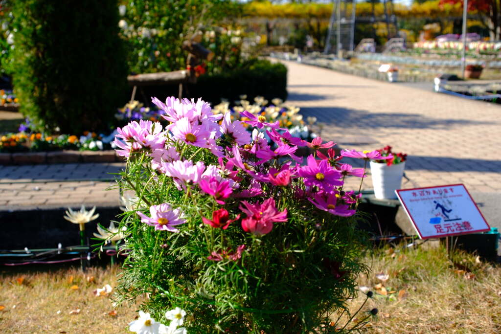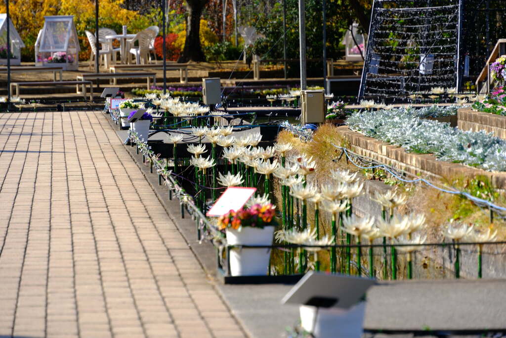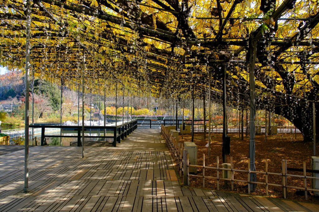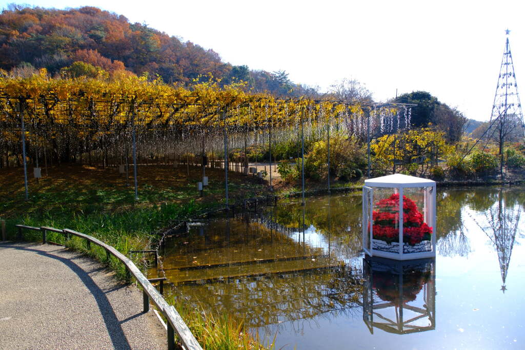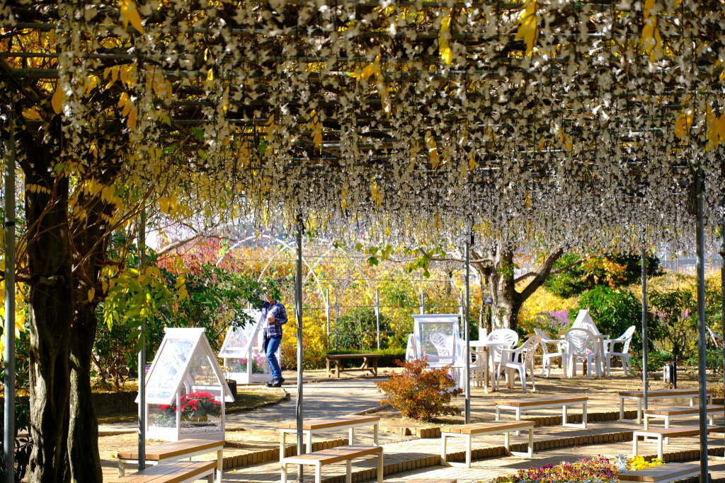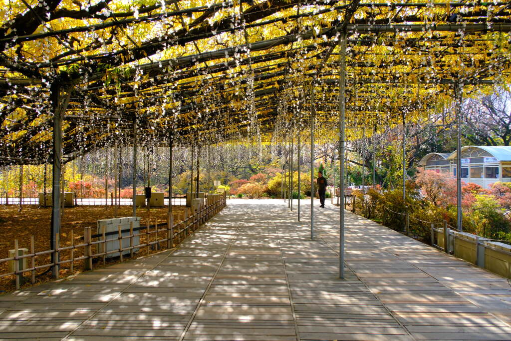 In spring, the park is filled with magnificent wisteria blooms centered around its famous large wisteria trellises, while in winter, a large-scale illumination event transforms the entire park. As a result, the atmosphere changes completely from season to season.