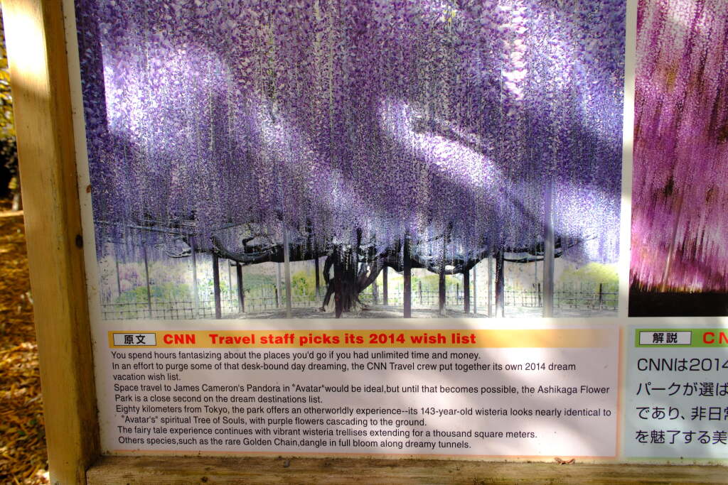 The main attraction in spring is wisteria (wisteria), a climbing vine that produces long, hanging clusters of flowers. Wisteria has been admired in Japan for centuries, and the scale of the wisteria displays at Ashikaga Flower Park is particularly impressive. These landscapes have received international recognition, and in 2014 the park was selected by CNN Travel as one of its “Places to Visit” on the 2014 Wish List. In the article, the wisteria scenery was described as an alternative destination for those who dream of visiting the fantastical world seen in the film Avatar.