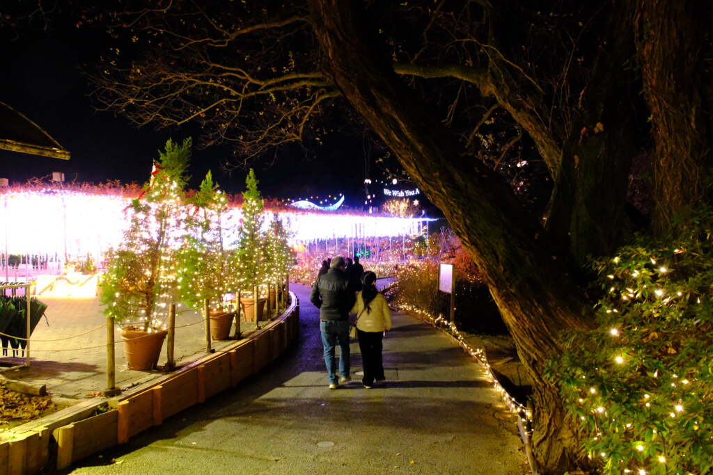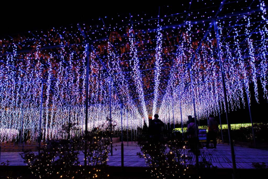 In contrast, winter brings a large-scale illumination event that uses the entire park. During this season, flowers are not the main focus; instead, visitors enjoy carefully designed light displays. Pathways, wisteria trellises, and areas around ponds are illuminated, creating a completely different atmosphere from the daytime scenery.