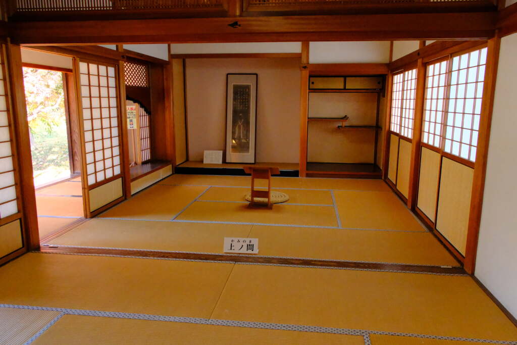 It features elements of shoin-zukuri architecture—such as a tokonoma alcove, staggered shelves, and a built-in desk area—giving the room a sense of formality and prestige.