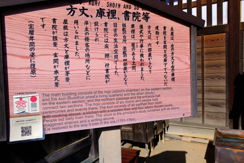 Many structures, including the Hojo (the headmaster’s quarters), have been reconstructed to reflect their mid-Edo-period appearance (around 1756). These restoration projects began in 1988 and were completed in 1990.