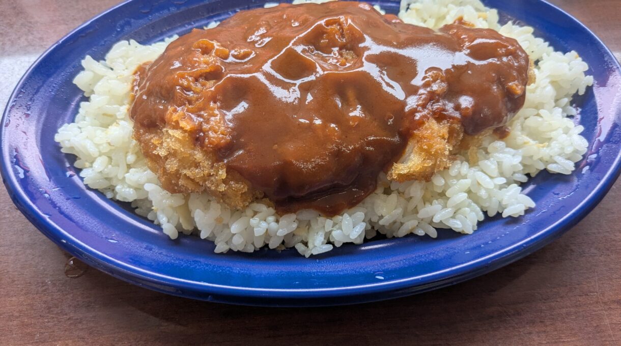 It consists of butter rice with bamboo shoots, topped with a thin pork cutlet and covered in demi-glace sauce.