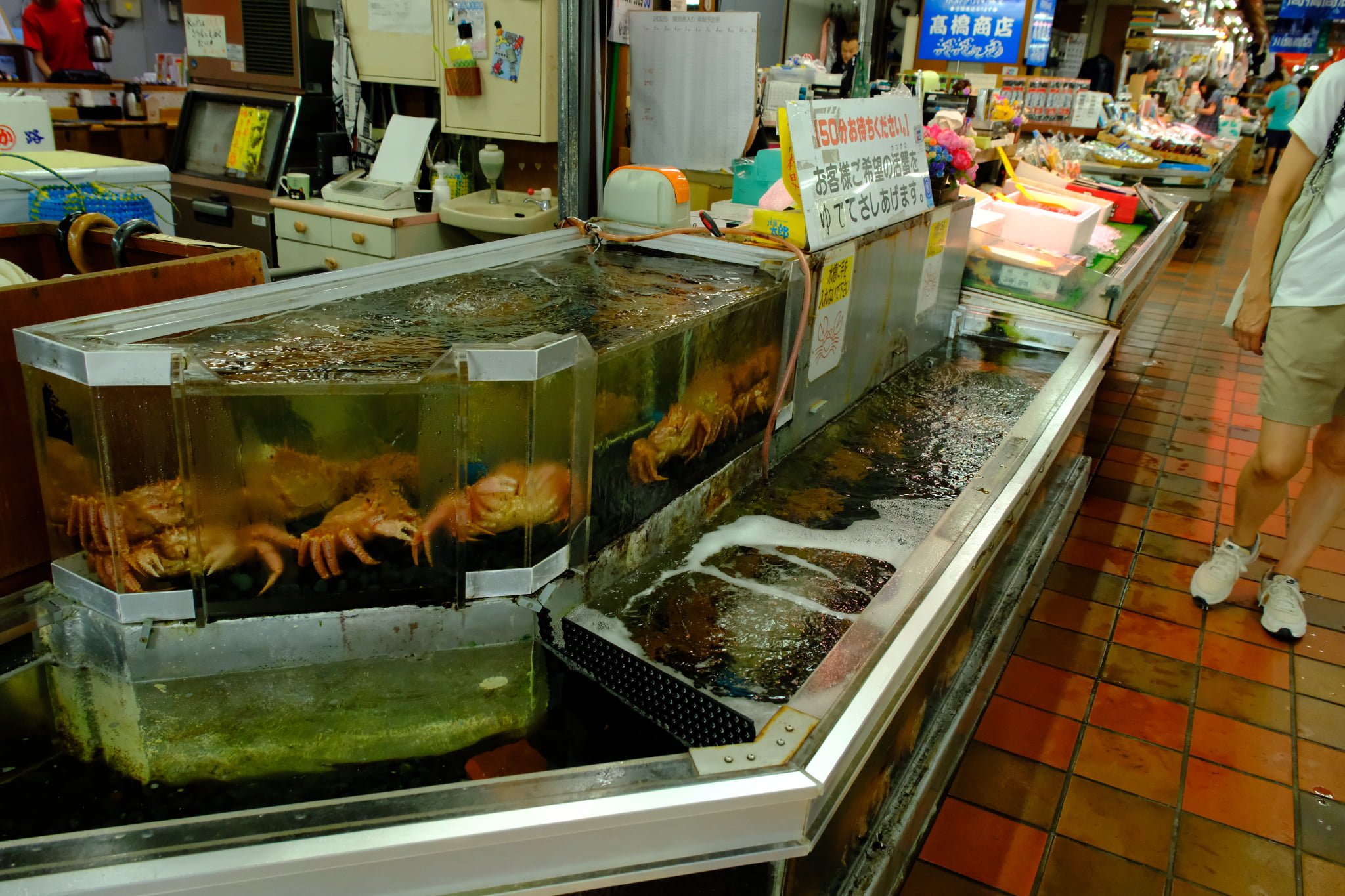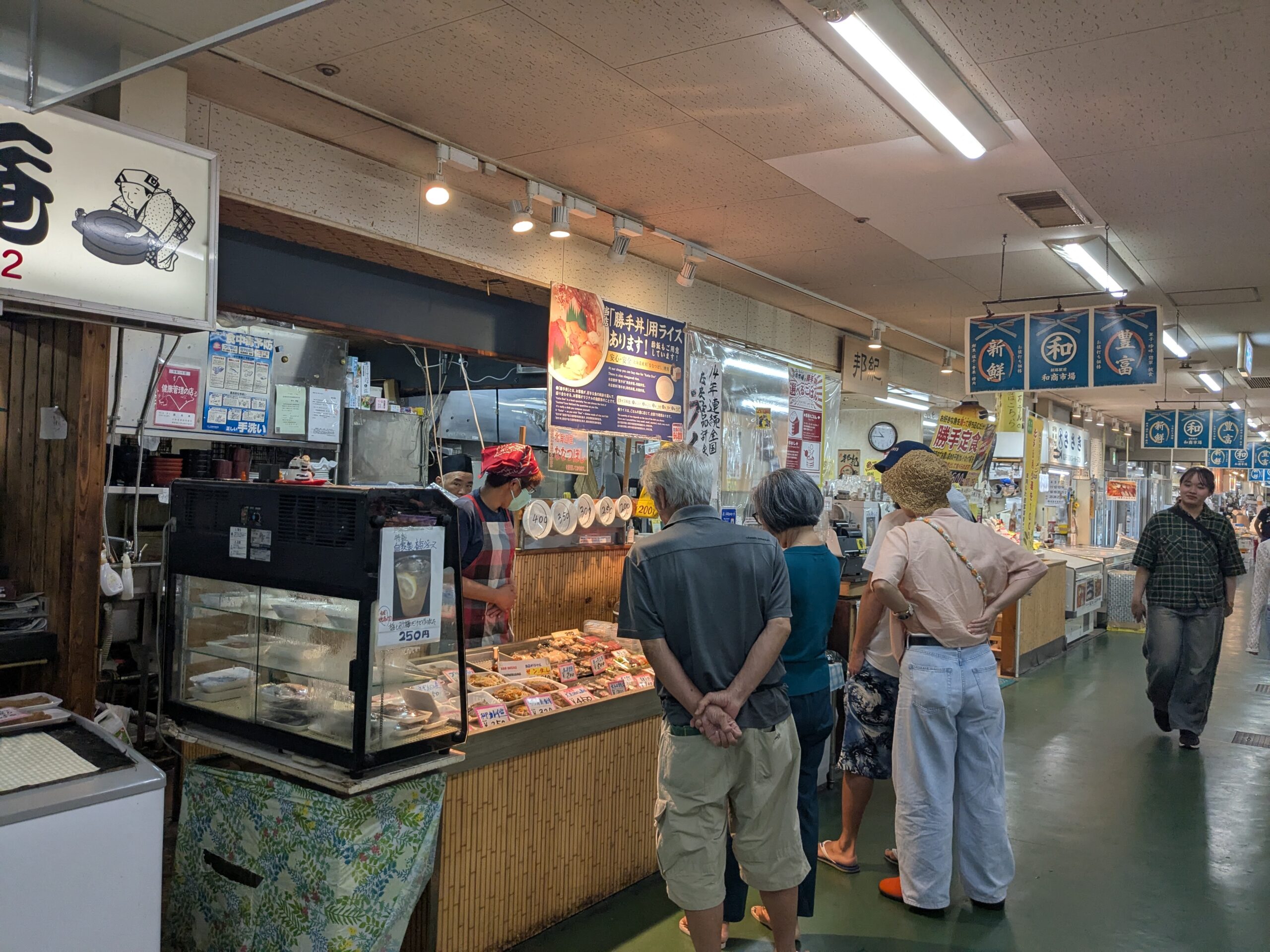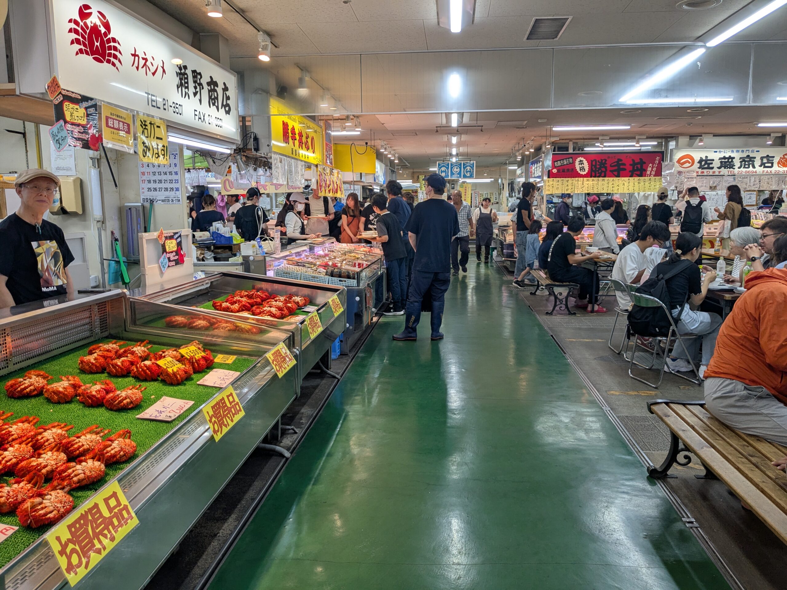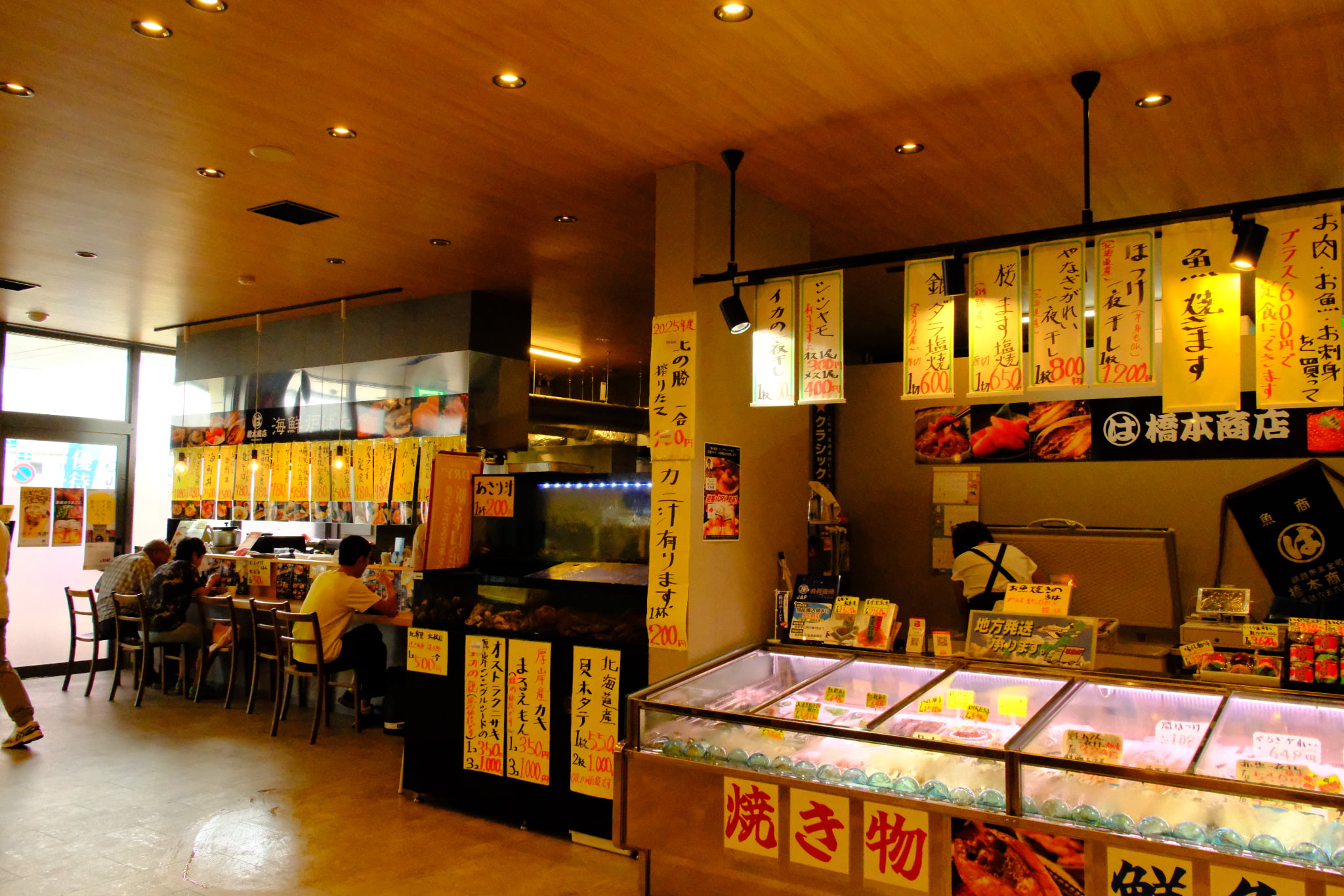 These two markets are located across the street from each other, both within walking distance of the station. Each offers fresh seafood, but Washo Market is larger and also sells souvenirs, while Tancho Market Gourmet Hall has a newer, more compact atmosphere.