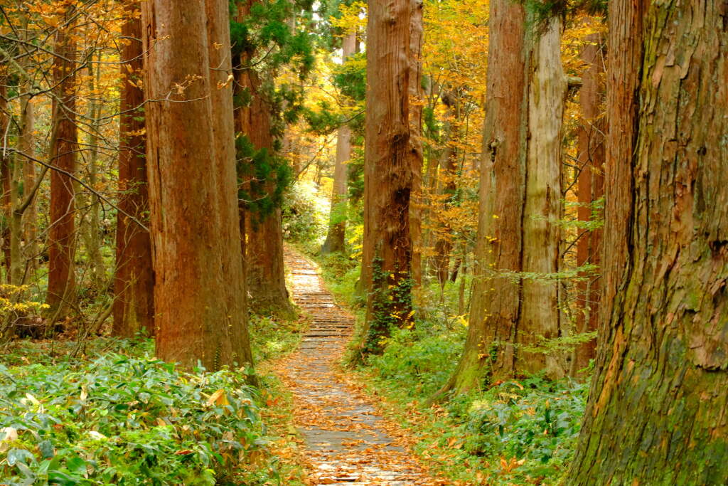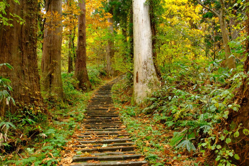 From the foothills to the summit, a stone staircase of approximately 2,446 steps extends through a forest of towering cedar trees. Rather than a test of endurance, this path has been understood as a way to walk calmly while reflecting on oneself, step by step.