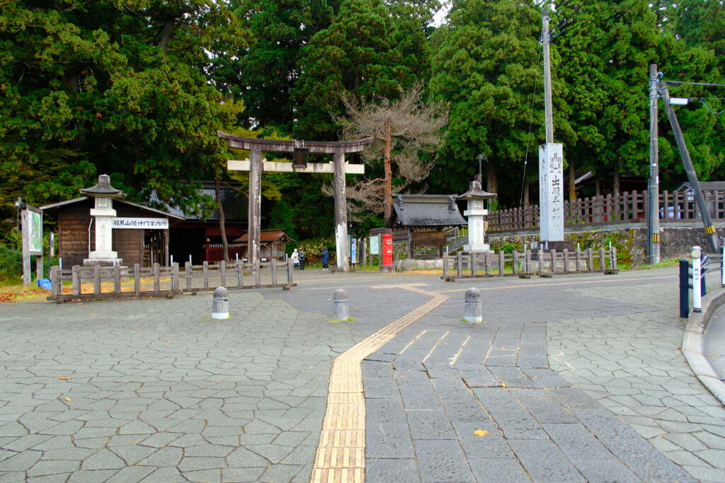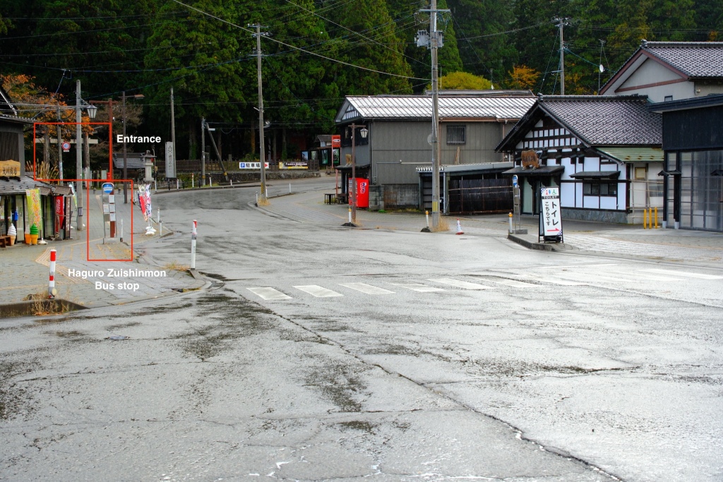 Haguro Zuishinmon Bus Stop and the entrance to the foothills. They are very close to each other.