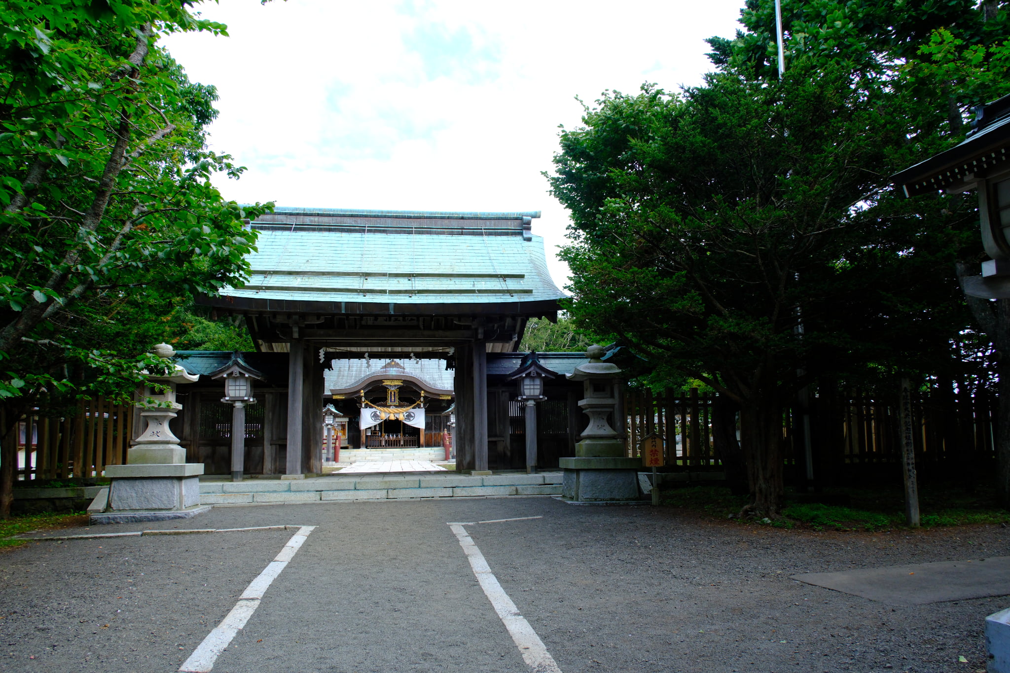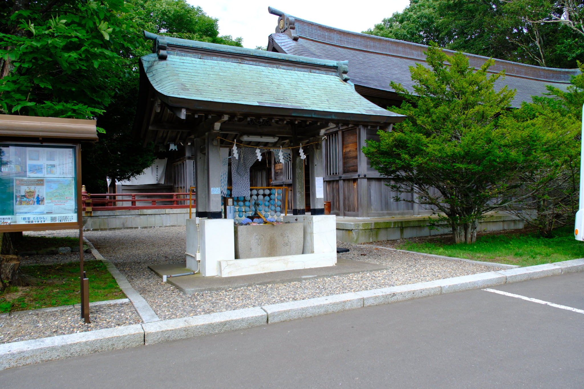 The shrine stands on a hill overlooking Nemuro Port, offering a serene view of the sea.