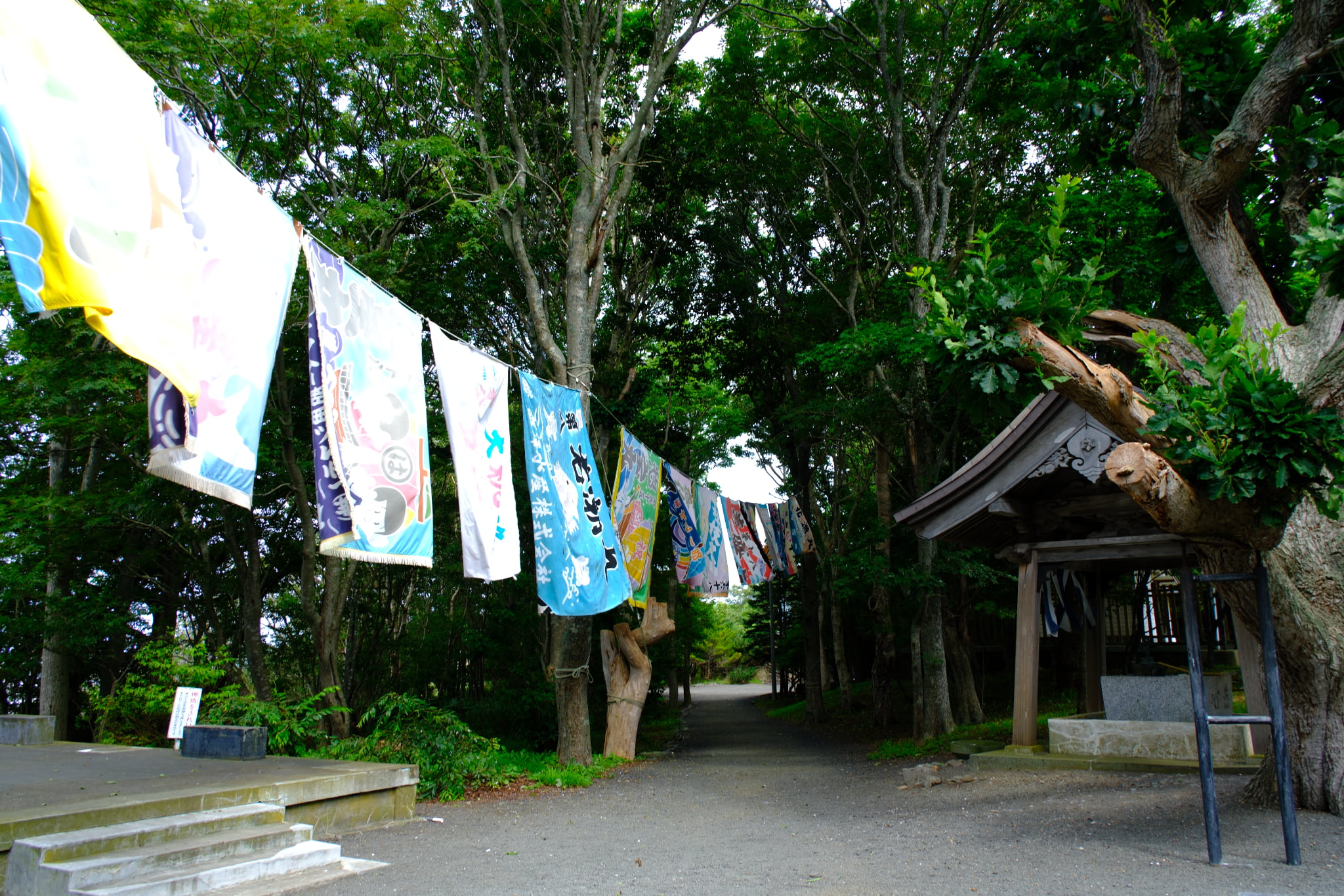 The shrine grounds are simple yet dignified, with a main hall, stone torii gate, and vibrant banners that create a distinctly coastal atmosphere.