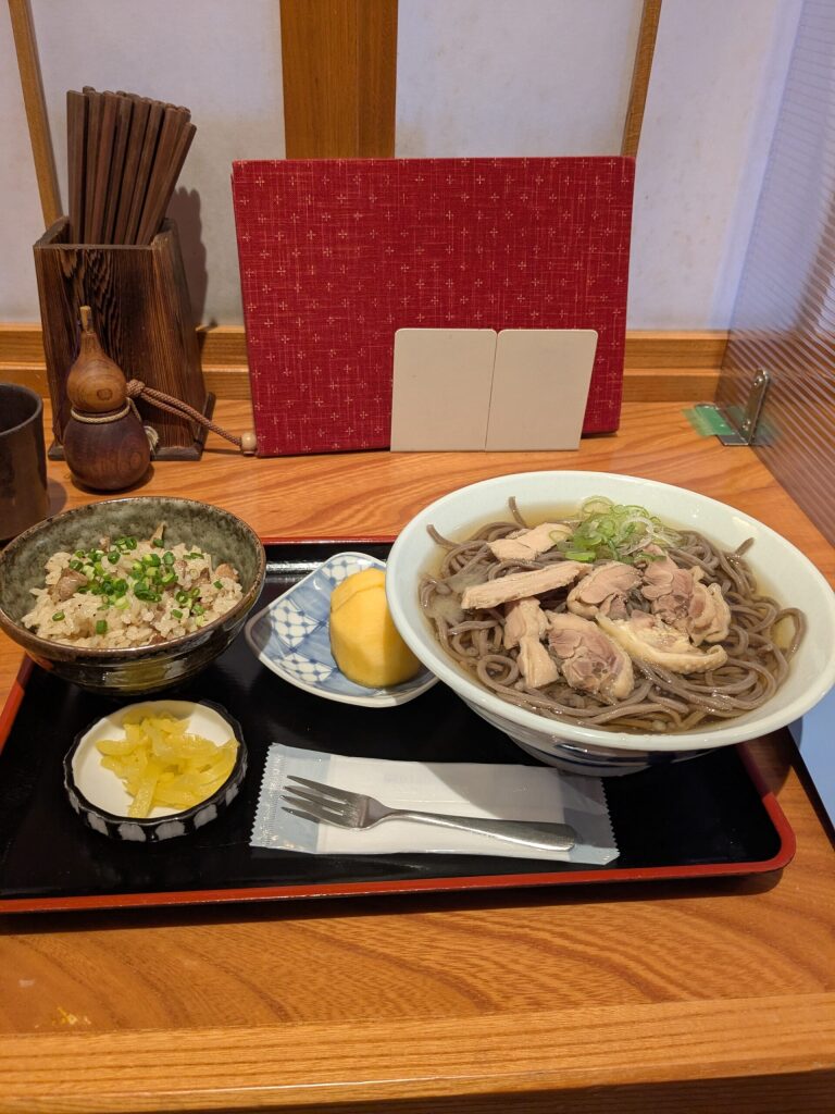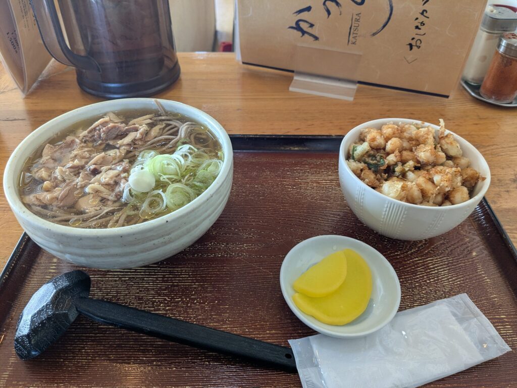In this region, nikusoba is made with cold soba noodles, topped with slices of firm chicken, and served in a sweet-savory, richly seasoned broth. It’s a deeply local style of soba.