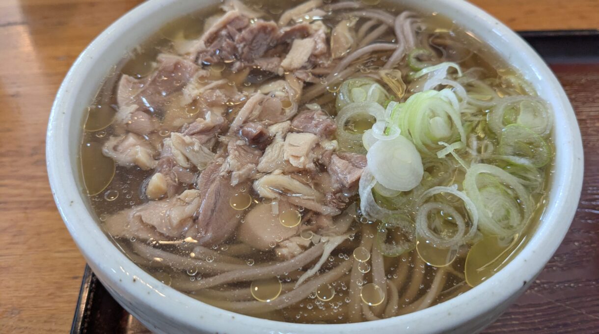 In this region, nikusoba is made with cold soba noodles, topped with slices of firm chicken, and served in a sweet-savory, richly seasoned broth. It’s a deeply local style of soba.