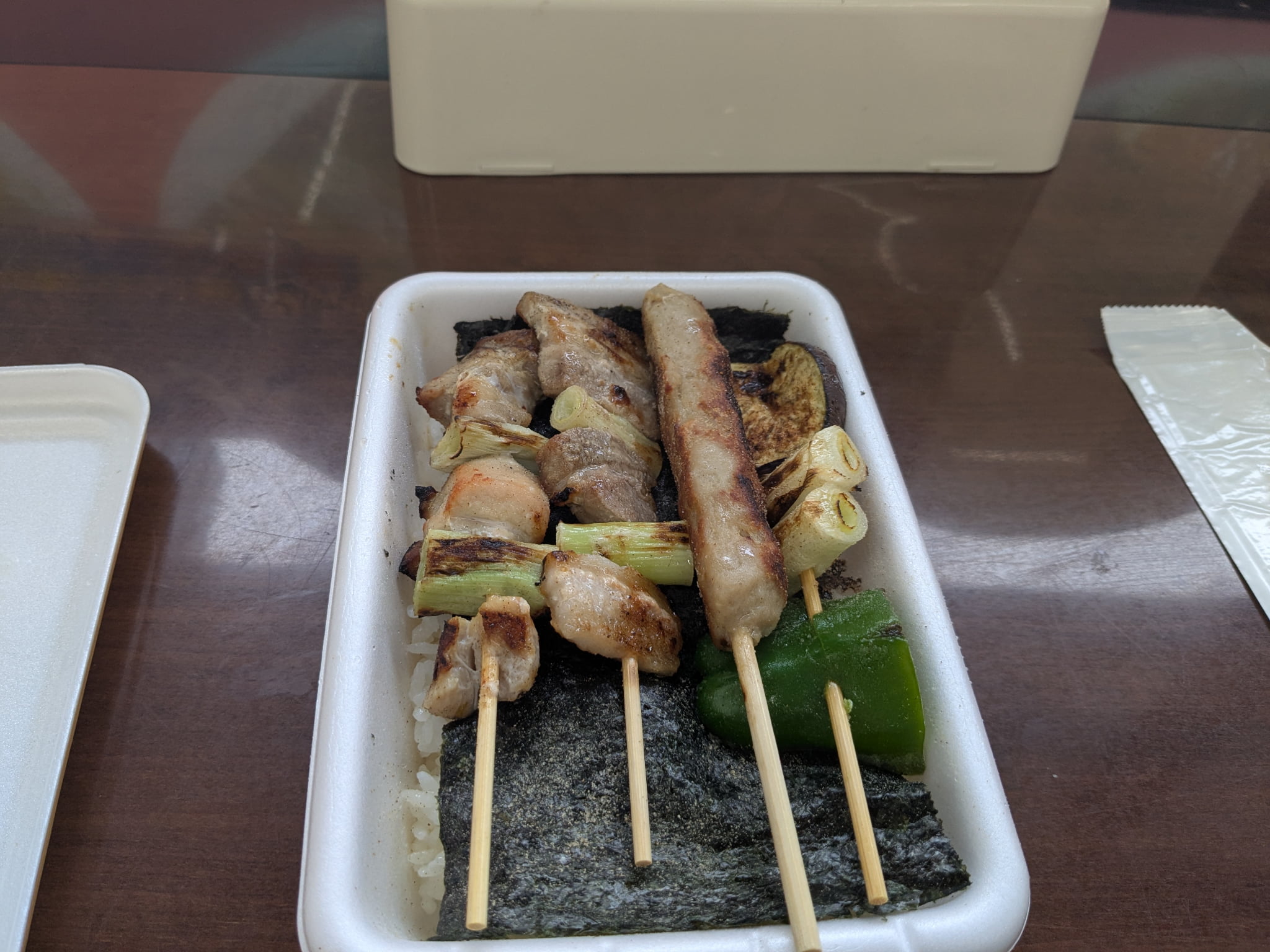 1:Open the lid — you’ll see the skewers laid over the rice. (Photo: Yakitori Variety Bento)